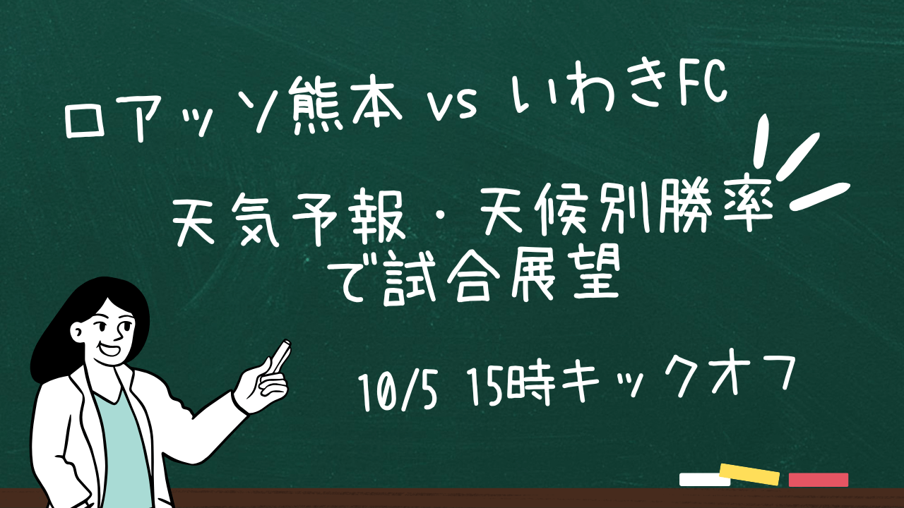 10月5日(日)、ロアッソ熊本は午後3時キックオフで、ホーム・えがお健康スタジアムにいわきFCを迎えます。 このプレビューでは、天候別成績に加え、15時前後の時間帯予報も盛り込み、よりリアル感をもたせてお届けします。